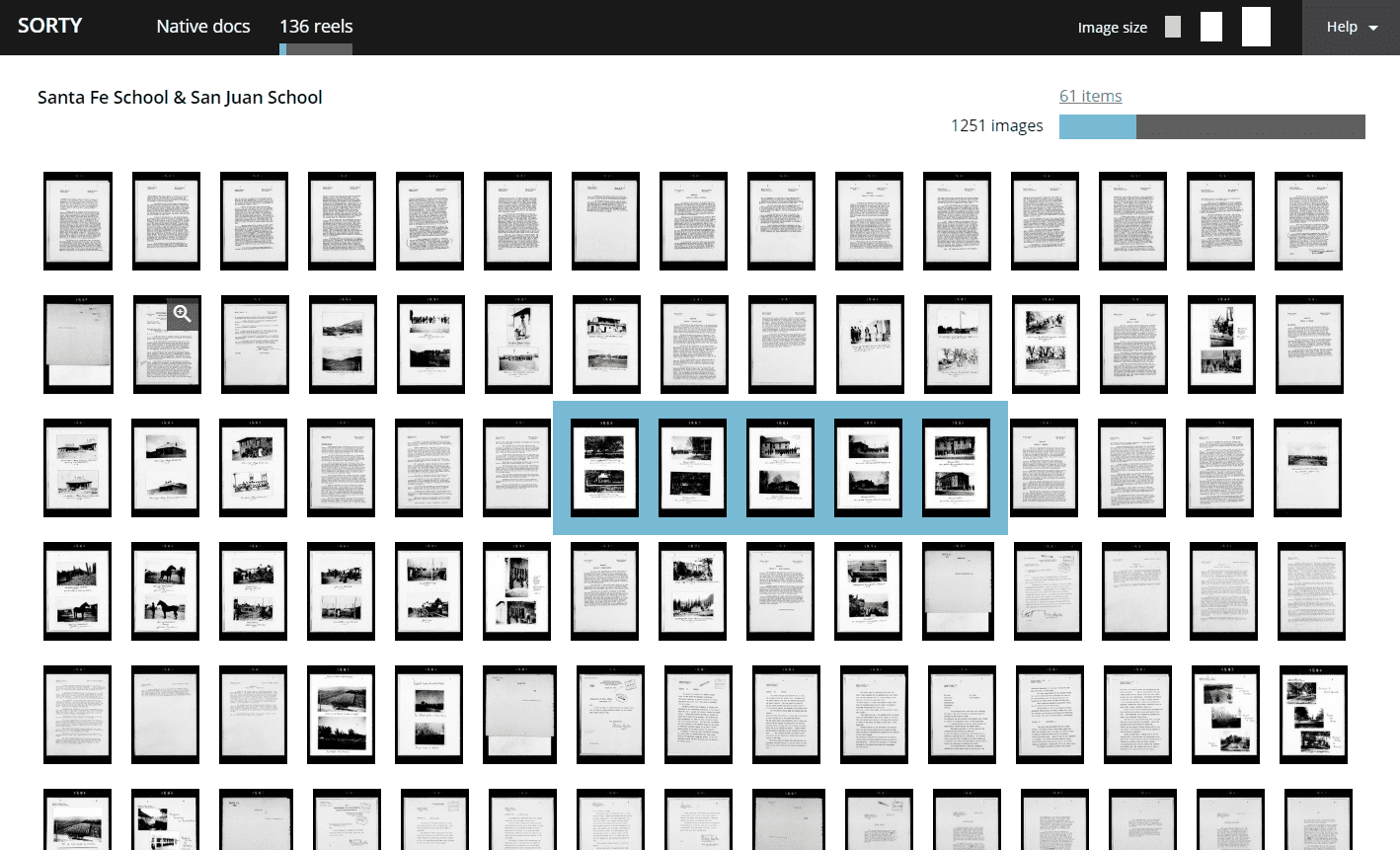 Sorting Room is a tool for use in a Digitise First workflow. It's the physical equivalent of viewing the material spread out on a table, and making selections from it to group images together into items.